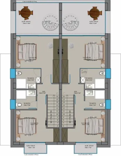 Te wille to nie tylko nieruchomości; są Twoją bramą do nowoczesnego i wygodnego stylu życia. Znajdziesz tu szeroką gamę wysokiej jakości urządzeń i mebli, które uczynią Twoje życie wygodniejszym i przyjemniejszym. Niektóre z urządzeń znajdujących się w zestawie to wbudowana lodówka z zamrażalnikiem, kuchenka elektryczna z czterema palnikami, wbudowany piekarnik na wszystkie kulinarne przygody, pralka SOLO 5 kg, wbudowana zmywarka do bezproblemowego czyszczenia, stylowy ekstraktor wentylator, suszarka do włosów, toster kanapkowy, zwykły toster, 50-calowy telewizor Smart LED do rozrywki i dystrybutor wody. Nasze wille są w pełni umeblowane, dzięki czemu możesz od razu się wprowadzić i zacząć cieszyć się nowym życiem na Cyprze Północnym. Umeblowanie obejmuje 1 rozkładaną sofę zapewniającą dodatkową przestrzeń do spania, 1 wygodny fotel z zagłówkiem, 4 pojedyncze łóżka zapewniające spokojny sen, stół jadalny i krzesła do rodzinnych posiłków, stolik kawowy do porannych rytuałów kawowych, szafkę pod telewizor oraz Telewizor do rozrywki, stoliki nocne dla Twojej wygody, krzesła jako dodatkowe miejsca do siedzenia i stół jadalny do wypoczynku na świeżym powietrzu.